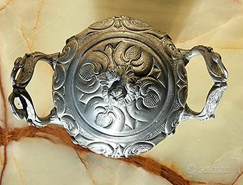 La superficie metallica è delicatamente lucida, raffinata e possiede quell'aristocratica lucentezza argentea caratteristica dei pezzi decorativi italiani di alta qualità del XX secolo. I rilievi sono accuratamente scolpiti: foglie, riccioli, motivi floreali, come un mosaico trasferito dall'antica stanza di una contessa.
