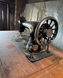 Vendo bellissima macchina da cucire Singer vintage a pedali, anni 20'-40', pezzo d'antiquariato originale con mobile in legno massiccio e base in ghisa decorata. Condizioni buone per l'età, visibile nella foto: decorazioni dorate intatte, pedale e cassetti presenti. Ideale per collezionisti, hobbisti o arredamento rustico/shabby