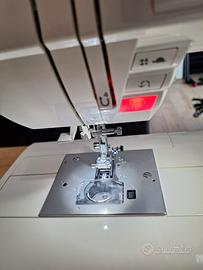 Macchina per cucire elettronica; 100 punti utili; 5 alfabeti, 34 punti decorativi; 13 occhielli; display LCD su 4 livelli; regolazione velocità cucito, tasto start/stop; tavolino allungabase e piedino doppio trasporto inclusi