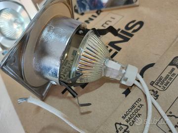 Sistema di 3 faretti alogeni da incasso. Acciao inox. Misure 9x9. Completi di luce alogena.