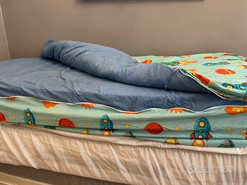 Vendo (per passaggio a materasso una piazza e mezza) sistema lenzuola letto singolo completo di piumone, prodotto per evitare che i bambini si scoprano durante la notte.