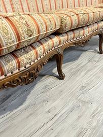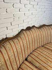 Sofà a tre posti, struttura in legno massiccio con intagli floreali e cartoccio centrale, gambe cabriole, tappezzeria damascata a righe beige-rosso-oro.