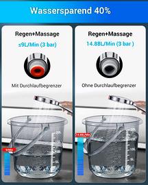 - Risparmio energetico e idrico: Dotato di un limitatore di flusso, consente di risparmiare fino al 40% di acqua, mantenendo un flusso di 9L/min a una pressione di 3 bar. Perfetto per chi desidera ridurre i consumi senza rinunciare alla qualità della doccia.