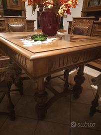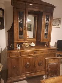 Vendo bellissimi mobili completamente originali primi '900, come da foto una credenza a 4 ante e cassetti con vetrina a 2 ante con vetri colorati dell' epoca,altezza 250 cm larghezza 170 cm,seconda credenza a 4 ante e cassetti,completa di specchio e due ante sempre con vetro,stesse misure precedenti,tavolo rettangolare con stesse lavorazioni , dimensioni cm 100 x116 cm,completano il tutto n'6 sedie con seduta e schienale ricoperti in pelle e borchiate. La pelle essendo originale evidenzia i segni del tempo,per il resto tutto in ottimo stato di conservazione. Non si effettuano spedizioni e si accettano solo pagamenti in contanti alla consegna
