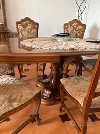 Tavolo rettangolare allungabile in legno, completo di 6 sedie con seduta e schienale imbottiti, rivestiti in tessuto damascato a motivi floreali, coordinati con lo stile classico del soggiorno.