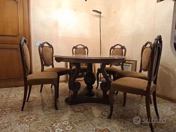 Soggiorno classico in legno realizzato da artigiano, anni '60, composto da credenza con ante e ribalta come da foto, tavolo in legno massello, 6 sedie in legno massello rifoderate recentemente in velluto.