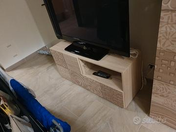 - Mobile porta TV L.122 H.57 P.43 con vano a giorno con passacavi e mensola in vetro 4mm, 1 anta e 1 cassetto