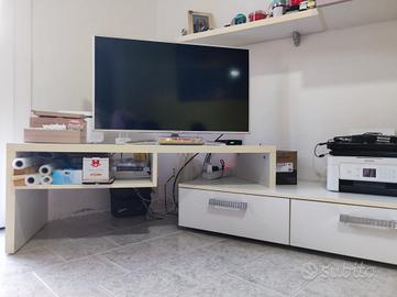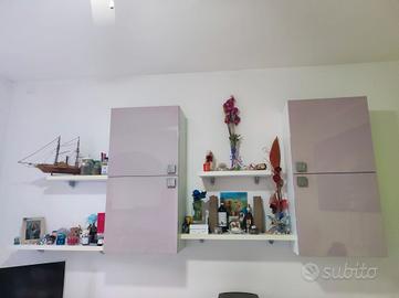 Vendo soggiorno completo in stile moderno composto da 2 moduli bassi + ripiano per postazione TV, 2 armadi componibili pensili + 4 mensole. Tutto funzionale Struttura resistente e stabile Ritiro a domicilio 2° piano s/ascensore