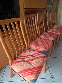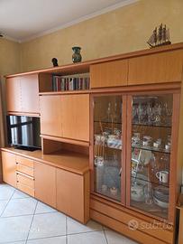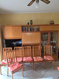 Vendo SOGGIORNO COMPLETO, composto da: MOBILE A PARETE, TAVOLO e 6 SEDIE in noce chiaro come da foto. Tenuti con cura.