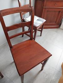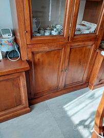 soggiorno in noce, arte povera, composto da 2 vetrine, 3 basi , un'angoliera base, 6 sedie e tavolo quadrato allungabile, più 2 mensole libreria