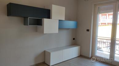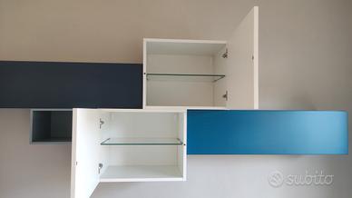 Causa trasloco, vendesi recente soggiorno componibile marchiato Sangiacomo (made in Italy) laccato opaco nei colori bianco, blu cobalto, bluette e carta da zucchero. I moduli bianchi hanno ripiano interno in vetro e apertura ad anta battente con premi-apri, quelli con apertura a vasistas hanno pistoni funzionanti e sono anche loro premi-apri.