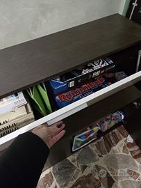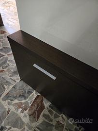Mobilio per soggiorno composto da tre basi marroni da 120 x 42 cm cadauna e due pensili / mobili da appoggio bianchi laccati della stessa misura.