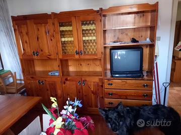 Soggiorno in legno con Vetrinetta e tavolo misure del tavolo 80 x120 con giro panca in legno misure 165 x 134 , in ottimo stato più 4 sedie vendo a soli 350 euro …..occasione Misure Vetrinetta 240x40. H190