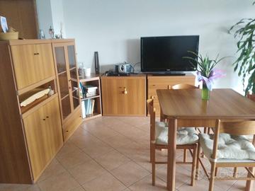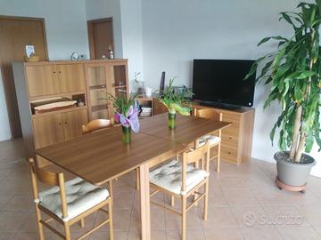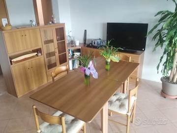 Soggiorno completo in ottimo stato Vendo soggiorno completo in ottimo stato. Legno di alta qualità. Costituito da: - due moduli (uno a vetrina e l'altro ad ante) larghi 82cm, profondi 42cm e alti 142cm. - una cassettiera a tre cassetti alta 76cm - un armadietto a due ante alto 76 cm. - un mobile ad angolo alto sempre 76cm (a parete 70x70) con due ripiani. - tavolo da 4 posti (90 cm x 90 cm) allungabile a 6 posti (180 cm x 90 cm). quattro sedie con cuscino. I moduli, cassettiera e armadietto a due ante sono interscambiabili. Le foto sono recenti. Trasporto a carico dell'acquirente. Ritiro comodo. Prezzo: 200€