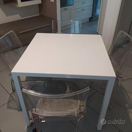 soggiorno con mensole e cassettoni, più tavolo bianco quadrato e 4 sedie trasparenti ,ottimo per casa al mare. Possibilità di trovarlo, smontato ma con ritiro a carico dell' acquirente