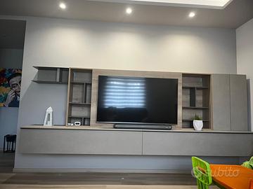 Parete TV con moduli contenitori, mensole e vano centrale porta TV.