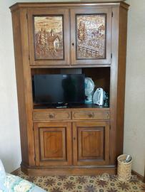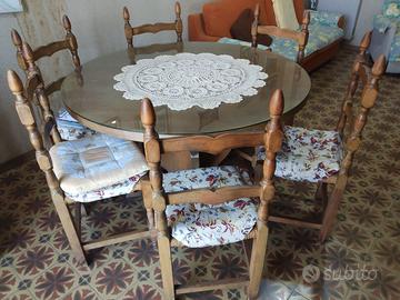 Soggiorno in legno, composto da due credenze, tavolo rotondo con 6 sedie, divano. Anche singoli pezzi separatamente.