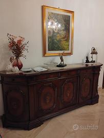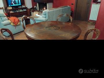 soggiorno in legno massello con intarsi composto di Credenza con vetrina, buffett, tavolo rotondo e 4 sedie con seduta imbottita di velluto. Usato ma tenuto benissimo