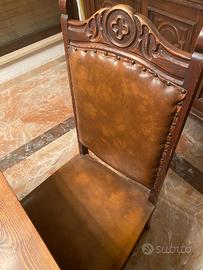 Soggiorno antico in legno noce massello composto da credenza, tavolo, sedie rivestite in pelle e cristalliera con mensole in legno.