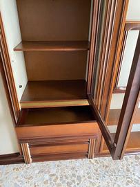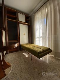 Mobile legno anni 70. Soggiorno/libreria/2 letti a scomparsa/ armadio/ vetrina / tavolo rotondo estensibile con 6 sedie. Molto funzionale la possibilità di aprire 2 letti a scomparsa.
