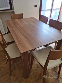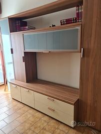 Mobile per soggiorno con 2 vetrinette,libreria e spazio porta tv con tavolo coordinato e sei sedie. Condizioni perfette. Vendo causa vendita casa. Misure totali del mobile: lunghezza cm 277, profondità cm 39, altezza cm 212. Spazio tv cm 185 x cm 82. Tavolo coordinato cm 140 x cm 90, allungabile. Completo di 6 sedie.