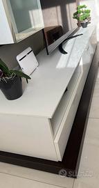 Mobile soggiorno 255 cm bianco con cubi credenze legno bianco e vetro e mensola a serpente legno scuro. Disegnati personalizzati pezzi unici e originali