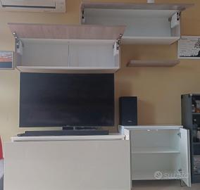 vendesi living, composto da un mobile basso con cassettone, un mobiletto con sportelli, 1 mensola e 2 pensile. in più anche un tavolo allungabile fino a 2,4 metri ottimo per almeno 8 persone.