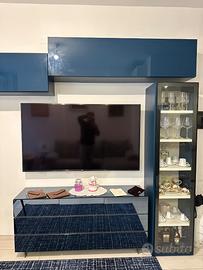 Vendesi soggiorno "Roche bobois" e divano "Poltrone e Sofà" completo e nuovo; acquistati nell'aprile 2022 (soggiorno e tavolo) e nel gennaio 2022 (divano). La composizione dell’arredo è la seguente: tavolo in vetro con 6 sedie, lampada, mobile tv (inferiore e superiore) e vetrina in colonna. Il divano è composto da un doppio rivestimento in blu e la L funge da contenitore.