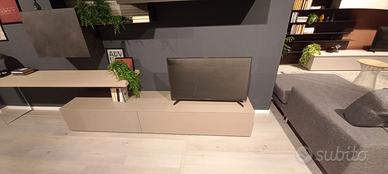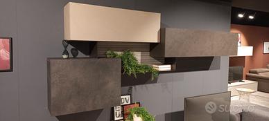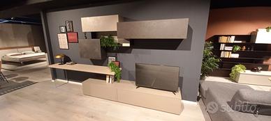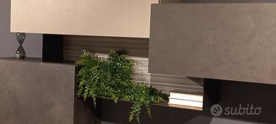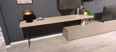Composizione soggiorno comprensivo di piano scrittoio con gambone in vetro. Finitura cemento scuro e cemento cava. Misure composizione L. 390 cm P. 50 cm H. 200 cm .