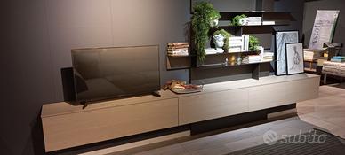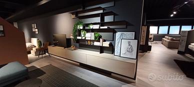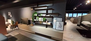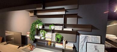 Soggiorno sospeso in finitura frassino oriente con mensole metallo finitura antracite e schienali mensole varie finiture. Misure composizione L. 396 cm P. 40 cm H. 230 cm .