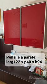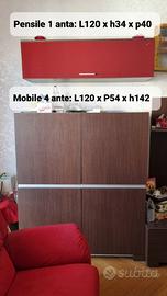 Soggiorno rosso laccato lucido abbinato a base e pensili noce. Misure: Pensile a parete: larg122 x p40 x h94; Pensile 1 anta: L120 x h34 x p40; Mobile 4 ante (da 60): L120 x P54 x h142 ; Base h38 x p64 x lung 2mt42cm ( 2 cassettoni). Ritiro a carico dell acquirente.