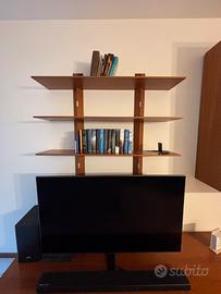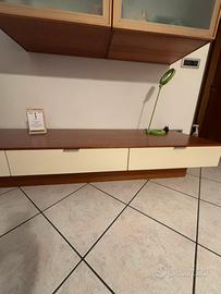Top ciliegio cm 320, base con cassetti laccati burro, libreria ( qui nascosta dalla tv che è stata aggiunta dopo) 4 ripiani ciliegio, cubo 2+2 ante in vetro satinato con telaio ciliegio.