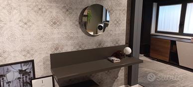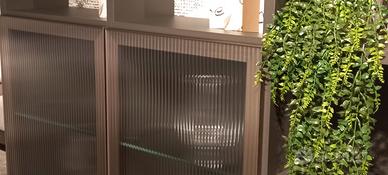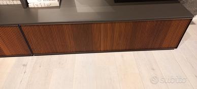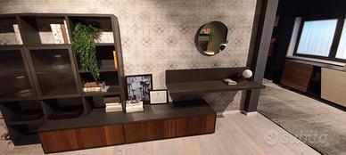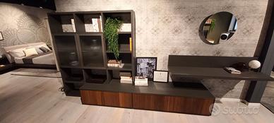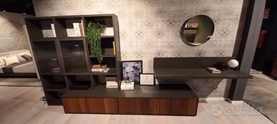 Parete attrezzata L. 400 H. 190 P. 50 cm. Struttura in finitura antracite con cassettoni con frontale noce canetato e vetrine con vetro lavorato. Piano sospeso da utilizzare come porta tv o in alternativa come piano scrittoio.