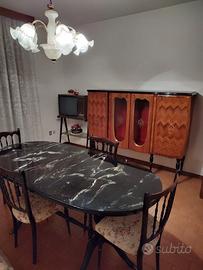Soggiorno usato anni 60 in radica interamente originale con ripiani, cassetti e chiavi ante. Tutti i mobili sono rifiniti con superficie in cristallo. 6 sedie ristrutturate imbottitura e copertura