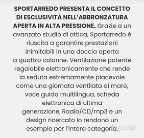 URGENTEMENTE vendo Solarium spotarredo HPO.Alta pressione ,antipanico comodo per i clienti e di facile pulizia. Vendo per chiusura attività,il solrium è già smontato solo da ritirare.Come nuovo nessun difetto.vero affare causa realizzo.possibilità di spedizione o trasporto prezzo da concordare.se avete bisogno di ulteriori informazioni basta contattarmiAFFARE.prezzo trattabile