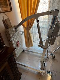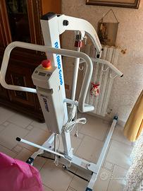 Salita e discesa del paziente tramite attuatore lineare elettrico a 24V DC e pulsantiera con cavo. Ampia estensione del braccio per consentire la presa del paziente da terra. Portata 140kg. Imbracatura regolabile con contenimento del capo. Struttura realizzata in acciaio verniciato.