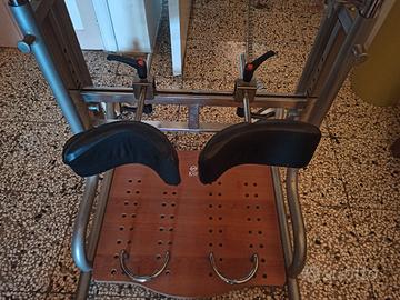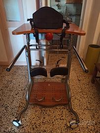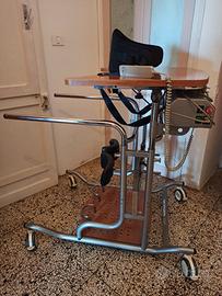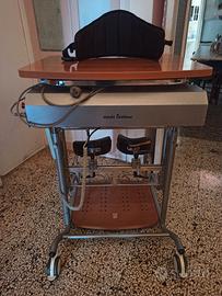 Misura regolabile da medio a grande per adulti. Telaio portante con doppie colonne di scorrimento telescopico per la regolazione indipendente dell’altezza del poggiamani e del tavolo. Verniciato con polveri poliesteri ed epossipoliesteri. Base completa di 4 ruote gemellari e piroettanti D.100 mm. per lo spostamento. Pedana in legno finitura noce con fori per il fissaggio del fermatacchi e del fermapiedi. Tavolo in legno finitura noce regolabile in altezza, profondità antero- posteriore e inclinazione. Gruppo elettrico per la movimentazione di salita e discesa della fascia di sollevamento. Motore 230V-300W con scheda elettronica di controllo. Completo di pulsantiera a filo e cavo di alimentazione. Pulsante anteriore di fine corsa utente. Pulsante integrato supplementare per il comando di salita e discesa. Pulsante di emergenza. Regolazione altezza tavolo assistita da spintori a gas. Portata massima 125 Kg.