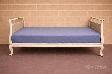 Somier letto stile Barocco Piemontese (circa 1975), realizzata in legno massello con elegante finitura tinta noce. Un arredo importante e scenografico, ideale per valorizzare una camera da letto che cerca un tocco classico e di carattere.