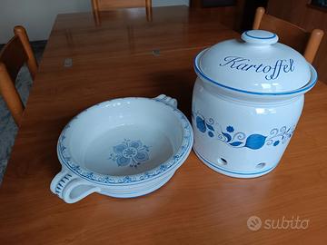 Porta patate con coperchio in ceramica bianca a decori blu. Altezza cm 24 e diametro cm 20,5. Nuovo a 34,00.