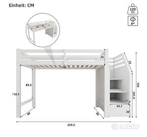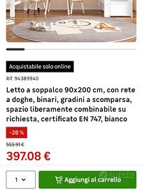 Vendo letto a soppalco bianco, 90x200 cm, con rete a doghe inclusa ed è perfetto per una cameretta. Nuovo, ancora inscatolato (vedi foto)