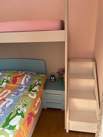 Soppalco con letto singolo con scala in legno con rette e matteraso . Sotto il soppalco con striscia led marca ricci casa .