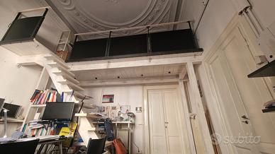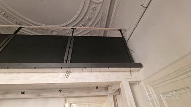 Soppalco in legno lamellare, con impalcato in assi di abete ammaschiati, scialone scala realizzato a taglio laser, rifinitura in cementite bianca, dimensioni in pianta della parte principale 2mtx5mt (10mq) + pianerottolo di fine scala accanto all'impalcato. Dimensioni adattabili con scarto di 30/70cm. Altezza di intradosso adattabile a qualsiasi (impostata a 270cm). Comprensivo di binario luce e balaustra in acciaio/legno, è escluso lo smontaggio e il trasporto a carico dell'acquirente.
