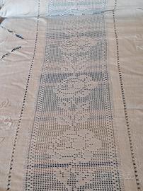Sopra Coperta matrimoniale realizzata con teli di lino vecchi e strisce di uncinetto fatte a mano. Pezzo unico realizzata completamente con lavorazione artigianale.