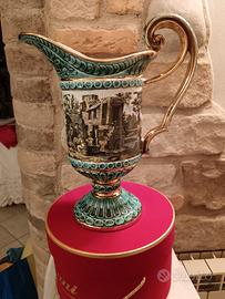 Vaso in porcellana con un manico, dipinto ai lati, numerato, color verde e decori in oro, alto cm 35,5