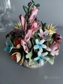 Splendido cestino di fiori in pregiata porcellana Capodimonte. Con due petali di altrettanti fiorellini (vicini) rotti (vedi ultima foto) e fogliolina incollata (penultima foto).