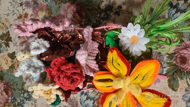 Soprammobile carriola in legno rosa e bianca con mazzetto di fiori all' uncinetto più fiore con scovolini in omaggio 🎁
