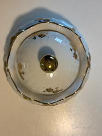 Idea per S. Valentino: soprammobile in porcellana Bavaria bianca, decorato con piccoli cuori dorati e un bordo a festoni anch'esso dorato. Il coperchio è sormontato da una sfera dorata. Utile per diversi usi: portagioie, portaoggetti, porta caramelle.