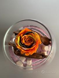 Vendo soprammobile bello e ben conservato con rosa multicolore stabilizzata e contenitore rotondo in vetro.