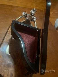Soprammobile raffigurante figurina in argento che suona il pianoforte apribile come contenitore. base e piano in radica di noce lucida.