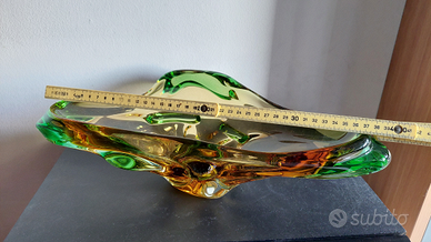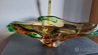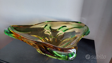 Soprammobile a ciotola in vetro di murano degli anni settanta. Colorazione: verde e ambra. Misure: 40 x 21 x 12 cm